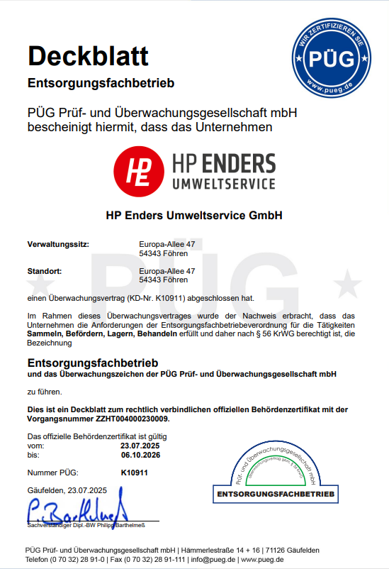 Unser Unternehmen ist seit 2005 ein zertifizierter Entsorgungsfachbetrieb nach EfbV. Hierzu werden wir jährlich von der Prüf- und Überwachungsgesellschaft mbH (PÜG) auf die Einhaltung der gesetzlichen Vorschriften hin geprüft.